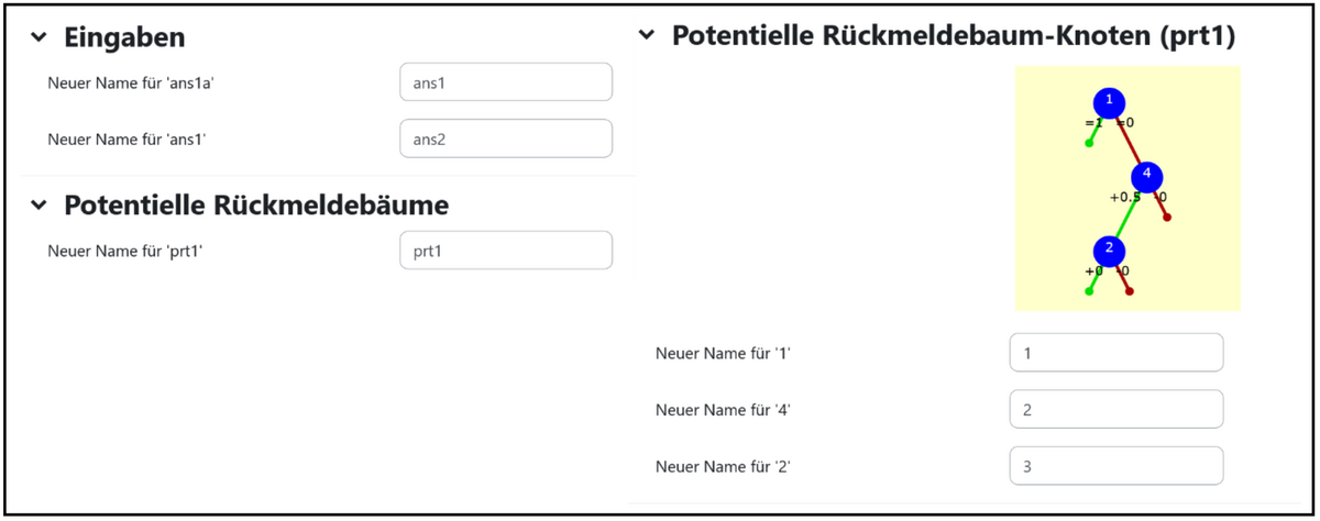 Mit dem „Tool zum Nachbessern der Frage” können diese Probleme schnell und einfach gelöst werden. Es handelt sich hier um ein in STACK integriertes Tool, mit dem die Namen von Eingabefeldern und Rückmeldebäumen sowie die Nummern der Knoten in Rückmeldebäumen jederzeit geändert werden können. Das Tool kann über die Fragensammlung (Abb. 1) oder das „Question Dashboard” 1 erreicht werden. Dort angekommen ist die Bedienung denkbar einfach: Im Bereich „Eingaben” kann für jedes Eingabefeld der STACK-Aufgabe ein neuer Name festgelegt werden. Analog geht dies für die Rückmeldebäume im Bereich „Potentielle Rückmeldebäume” (Abb. 2, links). Zusätzlich gibt es für jeden Rückmeldebaum einen eigenen Bereich, in dem die Nummern der Knoten für diesen Baum angepasst werden können (Abb. 2, rechts). Hier sind Eingabefelder bereits vorausgefüllt: Ein Algorithmus liefert eine sinnvolle Nummerierung der Knoten.